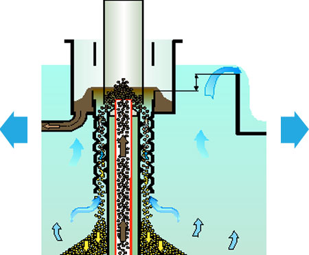 连续流砂过滤器可用于自来水的地表水和地下水的直接接触过滤,从而取消传统三段式处理工艺中的混凝池;在常规二级生化处理中,连续流砂过滤器可直接设在二沉池后,对二沉池出水进行深度处理,无须专设混凝池、澄清池等工艺设施。可直接在进水管线或渠道投加混凝剂,滤料在过滤器内的循环运动可起到搅拌作用。与常规三段式过滤相比较,连续流砂过滤器工艺使工程量和投资均显著降低,运行维护费用低,避免了传统三段式处理工艺设施繁多、工艺复杂、投资和运行费用高等缺点。